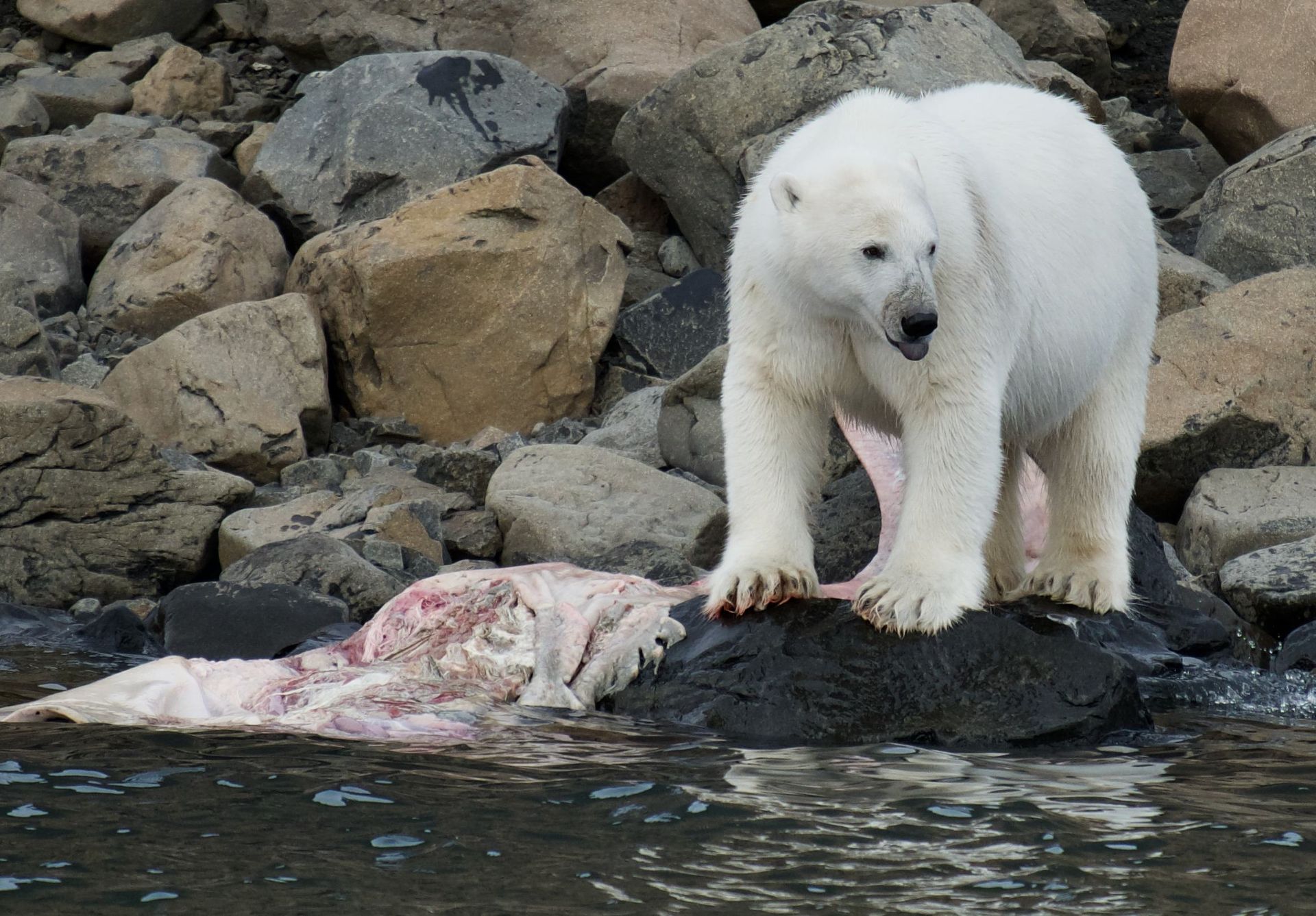 那是北極的一個午後,Andrew 鏡頭裡的北極熊正站在岩石上,牠的身旁,是一具被潮汐帶上岸的鯨魚屍體。畫面裡沒有掠食的暴力,只有一種近乎莊嚴的秩序——在這片極端的土地上,每一次進食都是生命的延續。