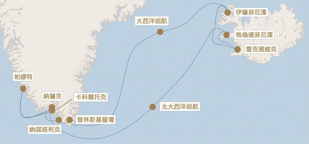 航線在冰島與格陵蘭之間展開,峽灣、漁村、殖民港口與古老遺跡彼此串連,維京與因紐特的時間在行走與停留之間自然疊上來。