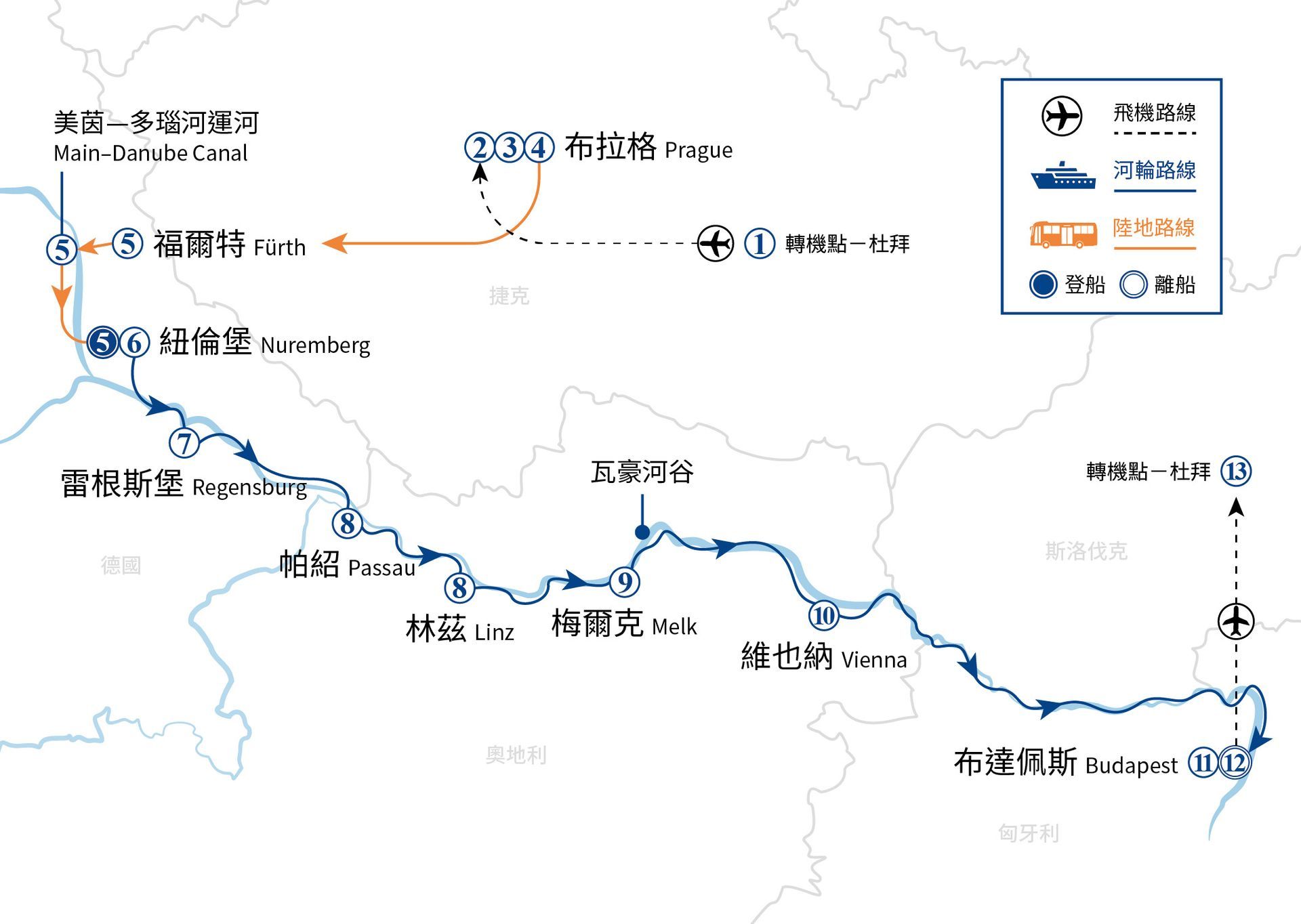 本行程結合「布拉格 3 晚深度+多瑙河河輪 8 天 7 夜」,由台北出發先走布拉格城堡、伏爾塔瓦河遊船、高堡與慕夏博物館,再經皮爾森啤酒博物館與美因—多瑙河運河前往紐倫堡登船,航行雷根斯堡、帕紹三河之城、林茲、梅爾克修道院與瓦豪河谷、維也納,終至布達佩斯。相較市面多為「單做河輪」或「布拉格另拆售」,我們以航陸無縫銜接,一次涵蓋「王權古都+運河工程+多瑙河文化走廊」。